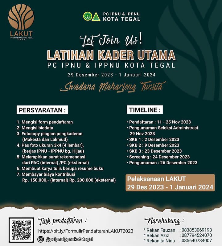 KOTA TEGAL, Suaranahdliyin.com – Pimpinan Cabang (PC) IPNU – IPPNU Kota Tegal kini tengah mempersiapkan Latihan Kader Utama (Laku), yang akan dilaksanakan mulai 29 Desember 2023 hingga 1 Januari 2024 mendatang. Pendaftaran dibuka mulai 11 hingga 25 November mendatang, sedang pengumuman seleksi administrasi akan dilakukan pada 29 November. Para calon peserta juga mesti melewati tahapan […]