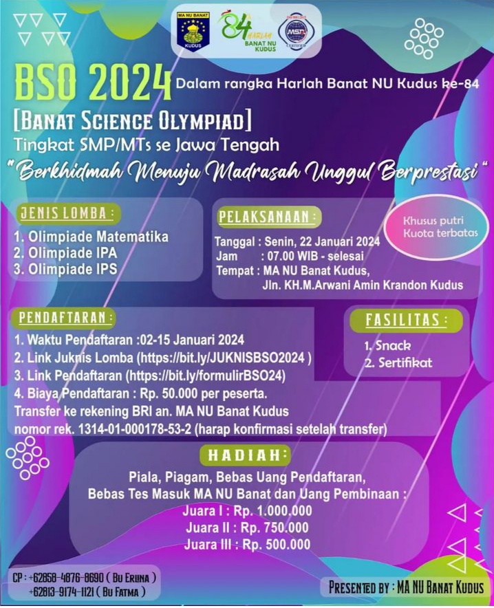 KUDUS, Suaranahdliyin.com – MA NU Banat mengagendakan menggelar “Banat Science Olympiad”, Senin (22/1/2024) mendatang. Banat Science Olympiad untuk tingkat SMP/ MTs se Jateng itu digelar dalam rangka menyemarakkan Hari Lahir (Harlah) ke-84. Ada tiga jenis lomba dalam olimpiade bertajuk “Berkhidmah menuju Madrasah Unggul Berprestasi” tersebut yang dikhususkan untuk putri itu, yakni: 1). Olimpiade Matematika; 2). […]