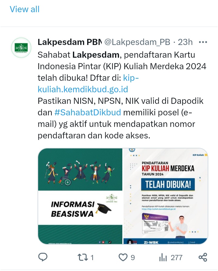 JAKARTA, Suaranahdliyin.com – Ada yang menarik mengamati Lembaga Kajian dan Pengembangan Sumber Daya Manusia (Lakpesdam) di jata maya, yakni salah satu Badan Otonom (Banom) Nahdlatul Ulama (NU) itu, kini aktif menginformasikan peluang beasiswa kepada publik melalui akun twitter: @Lakpesdam_PBNU. “Sahabat Lakpesdam, pendaftaran Kartu Indonesia Pintar (KIP) Kuliah Merdeka 2024 telah dibuka! Dftar di: https://kip-kuliah.kemdikbud.go.id. Pastikan […]