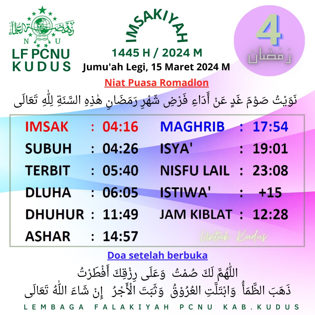 The post Jadwal Imsakiyah untuk Kudus dan sekitarnya, 4 Ramadan 1445 H appeared first on Suara Nahdliyin.