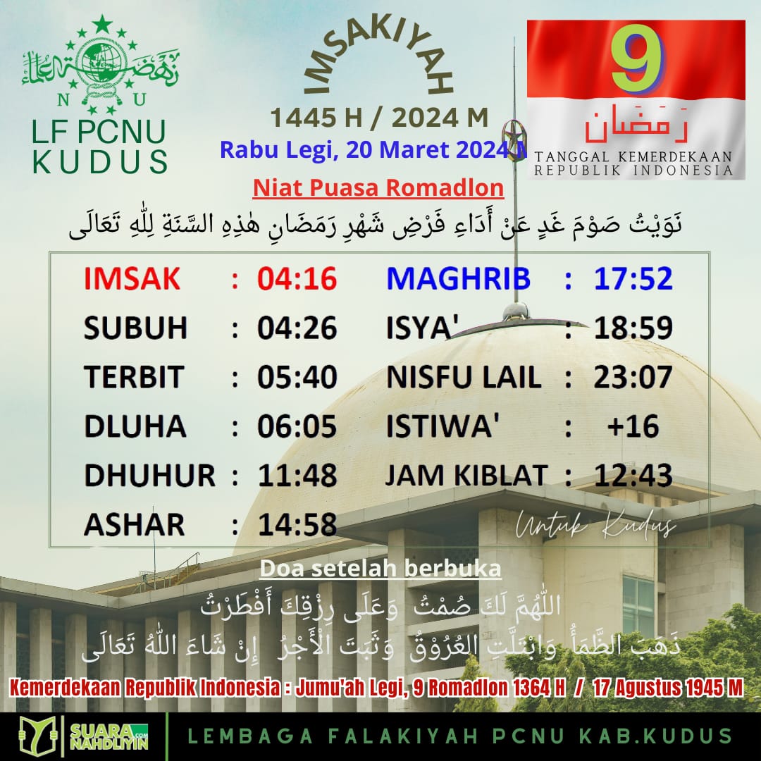 The post Jadwal Imsakiyah untuk Kudus dan Sekitarnya, 9 Ramadan 1445 H appeared first on Suara Nahdliyin.