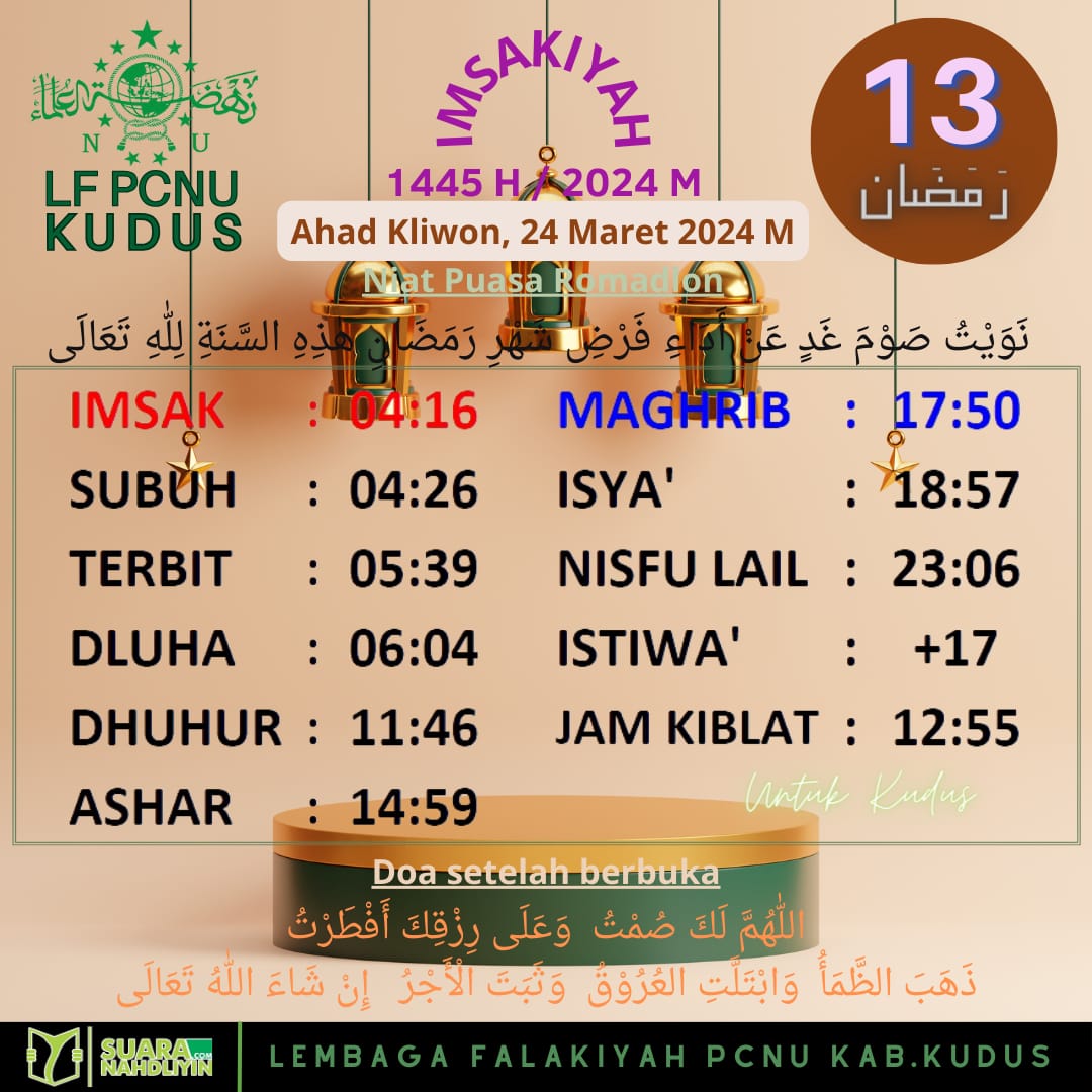 The post Jadwal Imsakiyah Untuk Wilayah Kudus dan Sekitarnya, 13 Ramadan 1445 H appeared first on Suara Nahdliyin.